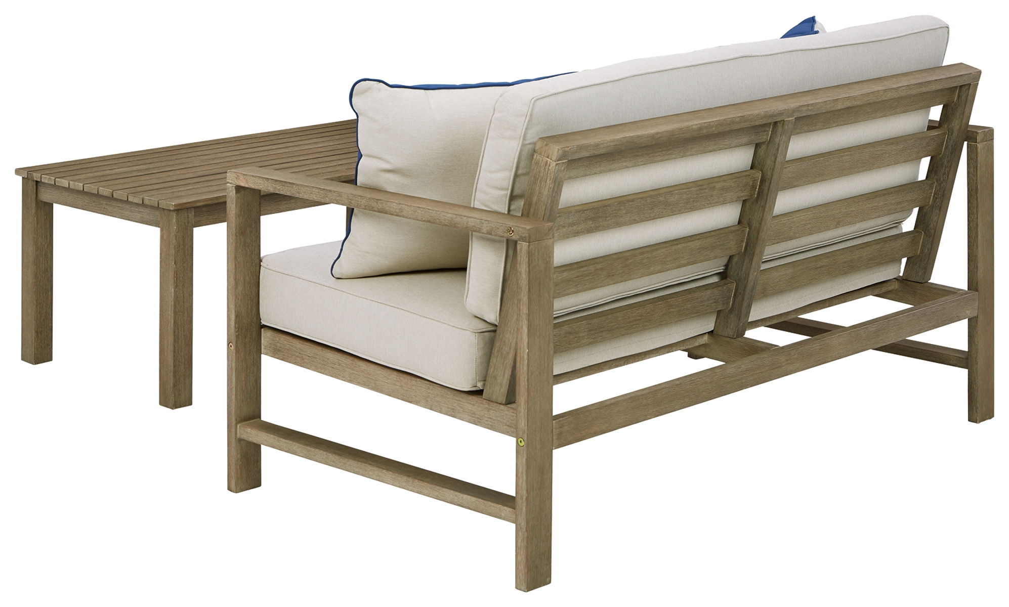With its sleek lines, gorgeous tone and cushioned comfort, this outdoor collection can make your outdoor space feel more like an upscale resort. Made for looks and longevity, this high-quality ensemble is built from eucalyptus wood treated to a deluxe embossed finish to brave the elements. Pair of throw pillows add a coastal cool touch.
